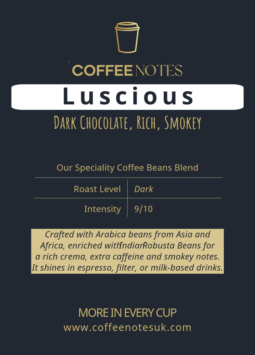 Experience a bold, daring espresso with our Fresh Roasted Coffee Beans Luscious Blend! Its smoky aftertaste and strength rating of 10/10 make it a daring choice for those who crave adventure. This dark roast boasts notes of rich dark chocolate and a perfect balance of strength and flavor, making it ideal for strong filter coffee, bold espresso, and delicious lattes.