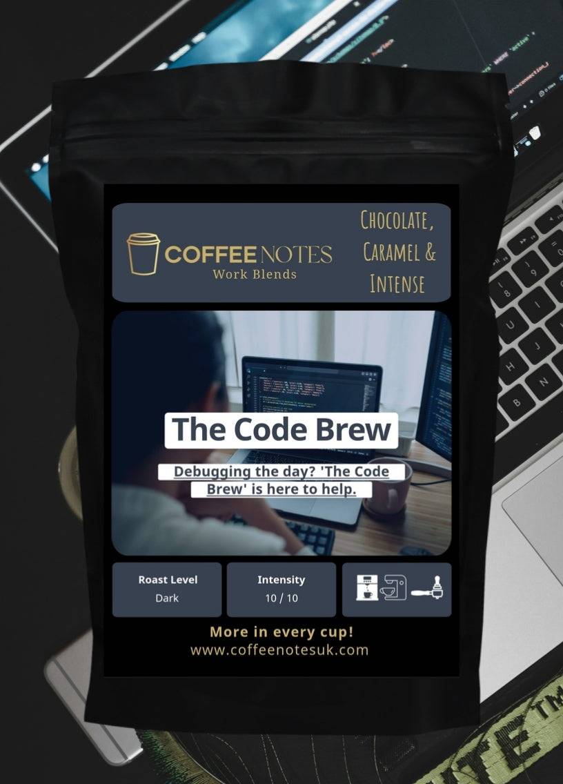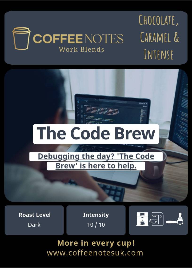 Fuel your team's coding sessions with The Code Brew, our high-caffeine coffee blend designed for maximum focus and productivity. Perfect for tech companies and offices where concentration is key. These premium coffee beans deliver a bold, robust flavor with an intense caffeine kick, helping your developers stay sharp and efficient. Ideal for late-night coding sprints and complex problem-solving. All from Coffee Notes.